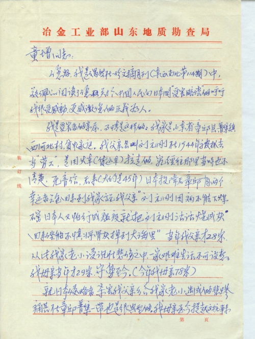 就日本侵略者杀害我父亲给我家老小造成的悲惨痛苦在章邱普集一带也是很典型的。我母亲至今提起这桩事来就痛哭,尤其是看了刘连仁这部电视后更是对话不见人,死不见尸的悲伤万[分]。今天能看到您的正义呼号甚感欣慰,这笔帐要算是天经地义的事。但不知具体细节和手续及需要的材料等等,请回信告诉俺,我将如实向您汇报。更愿参与这一民间索赔浪潮,需要的话我可以到您处面述。请回示。