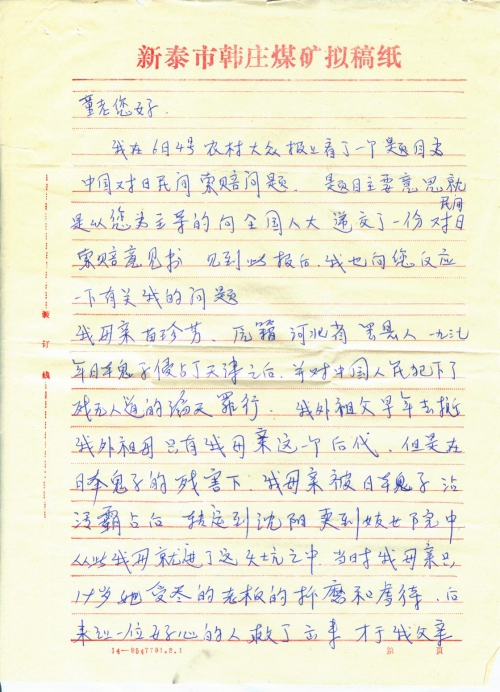 我在6月4号农村大众报上看到一个题目是中国对日民间索赔问题,题目主要意思就是以您为主导的向全国人大递交了一份民间对日索赔意见书,见到此报后,我也向您反[映]一下有关我的问题。