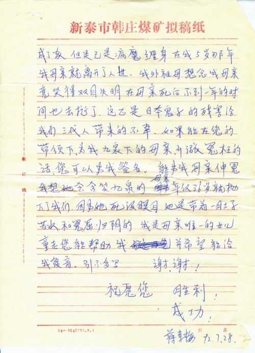 我母亲苗珍芳,原籍河北省罢县人,一九三七年日本鬼子侵占了天津之后,并对中国人民犯下了[惨]无人道的滔天罪行,我外祖父早年去世,我外祖母只有我母亲这一个后代,但是在日本鬼子的残害下,我母亲被日本鬼子[玷]污霸占后,转运到沈阳卖到妓女院中,从此我母亲就进了这火坑之中,当时我母亲只19岁,她受尽的老板的折磨和虐待,后来让一位好心的人救了出来,才于我父亲成了家,但是已是病魔缠身,在我5岁那年,我母亲就离开了人世,我外祖母想念我母亲竟哭得双目失明,在母亲死后不到一年的时间也去世了,这正是日本鬼子的残害给我们三代人带来的不幸,如果能在您的带领下为我九泉下的母亲[伸][张]冤枉的话,您可以为我签名,能为我母亲伸冤我想她会含笑九泉的,母亲年仅36岁就抛下了我们,因为她死没瞑目,她是带着一肚子苦水和冤屈归阴的,我是母亲唯一的女儿,童老您能帮助我并希望能给我复音。别不多写。谢谢!