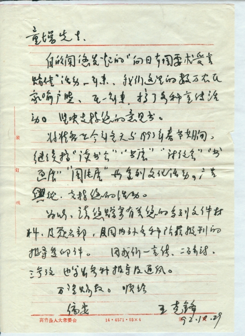 为此,请您赠寄有关您的系列文件材料及签名[簿],国内外各种阶段报刊的报导复印件。因我们一宣传,二研讨,三参考也写出各种报导及通讯。