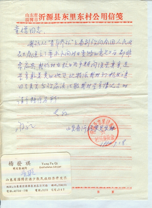 我们从“青年参考”上看到你向全国人民代表大会递交了要求民间对日索赔的意见书后,都非常高兴,我们村在抗日战争期间深受其害,是受害较深的地区,现特将我村干部杨发褀同志来京与你高谈汇报我村受害情况当时,请予接信为盼。