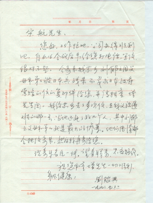 工作忙吧,公司办的顺利吧?自6.16会议后未给您打电话,写信,很对不起。今寄来我家乡刘郁之因父亲和弟弟被日本兵残杀而要求日本政府索赔的信的复印件给您,并请转童增先生阅。我给家乡去了多次信,在我父亲遇难的那一天,当地还死了好几个人,其中刘郁之父母和弟的死是最大的惨案。他们陆续都会把信寄来,然后我再寄给您。