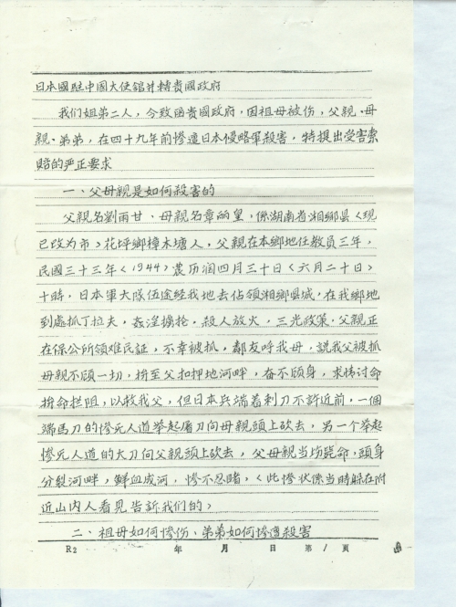 我们姐弟二人,今致函贵国政府,因祖母被伤,父亲、母亲、弟弟,在四十九年前惨遭日本侵略军杀害,特提出受害索赔的严正要求。