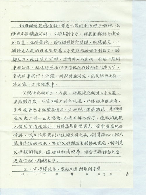 祖母听儿媳遭捉,带着六岁的孙子喊媳,正经日本军横过河畔,又碰上刽子手,将我弟脚踩手撕分为两边,立时气绝,而我祖母,拼命拦阻,以救儿孙,一个惨无人道的日本军拿着匕[首]竟将祖母奶下刺两刀,头部五刀,死后陈尸河畔,澄清的河城血河,奄奄一息的中国公民,就这样冤屈地悲惨地死在侵略者的屠刀下,至晚日军稍停十分钟,村邻路过河边,见我祖母还有一息之气,才抢救家中。