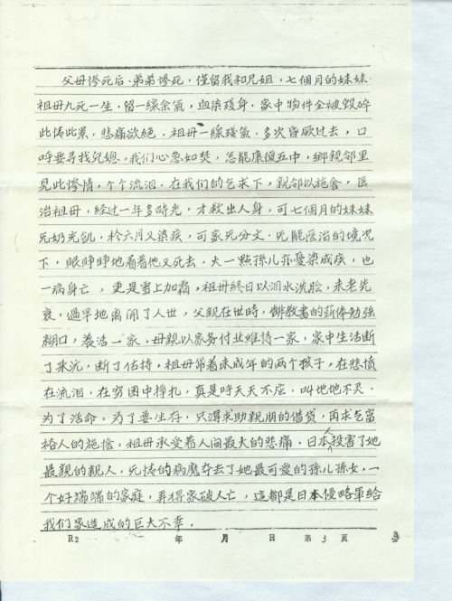 父母惨死后,弟弟惨死,仅留我和兄姐,七个月妹妹,祖母九死一生,留一线余气,血染残身,家中物件全被毁碎此情此景,悲痛欲绝,祖母一线残气,多次昏厥过去,口呼要寻找儿媳,我们心急如焚,怎能康复五中,乡亲邻里见此惨情,个个流泪,在我们的乞求下,亲邻以施舍,医治祖母,经过一年多时光,才救出人身,可七个月的妹妹无奶充饥,于六月又染疾,可家无分文,无能医治的境况下,眼睁睁地看着她又死去,大一点孙儿亦忧染成疾,也一病身亡,更是雪上加霜,祖母终日以泪水洗脸,未老先衰,过早地离开了人世,父亲在世时,靠教书的薪俸勉强糊口,养活一家,母亲以家务付业维持一家,家中生活断了来源,断了估持,祖母带着未成年的两个孩子,在悲愤在流泪,在穷困中挣扎,真是呼天天不应,叫地地不灵,为了活命,为了要生存,只得求助亲朋的借贷,再求乞富裕人的施舍,祖母承受着人间最大的悲痛,日本人杀害了她最亲的亲人,无情的病魔夺去了她最可爱的孙儿孙女,一个好端端的家庭,弄得家破人亡,这都是日本侵略军给我们家造成的巨大不幸。