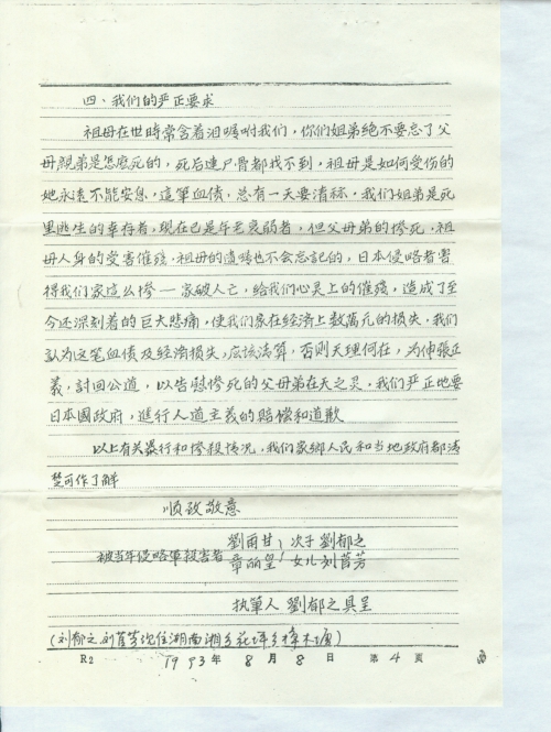 祖母在世时常含着泪嘱咐我们,你们姐弟绝不要忘了父母亲弟是怎么死的,死后连尸骨都找不到,祖母是如何受伤的,她永远不能安息,这笔血债,总有一天要清算,我们姐弟是死里逃生的幸存者,现在已是年老衰弱者,但父母弟的惨死,祖母人身的受害摧残,祖母的遗嘱也不会忘记的,日本侵略者害的我们家这么惨——家破人亡,给我们心灵上的摧残,造成了至今还深刻着的巨大悲痛,使我们家在经济上数万元的损失,我们认为这笔血债及经济损失,应该清算,否则天理何在,为伸张正义,讨回公道,以告慰惨死的父母弟在天之灵,我们严正地要日本政府,进行人道主义的赔偿和道歉。