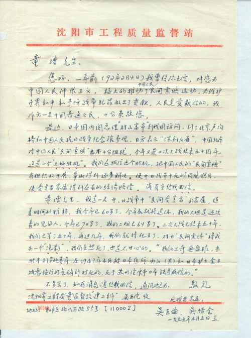 童增先生,我是一名中、日战争中“民间受害者”的家属,随着时间的推移,我今年已60岁了,今年底就将退休,我的大姐是还活着的见证人,今年已70岁了,我的二姐已64岁了。二次大战已结束五十年,我们已等了五十年,再过几年,我们就将死去了,对日“民间索赔”将成为一个“泡影”,我们虽然死了,也是不甘心的。“我的三哥吴盘根,当时才21岁的青年,在1943年4月被日本医师内山(男)和日本护士金子执意强行打气胸针打死的,死于苏州沧浪亭日本铁道病院的。”