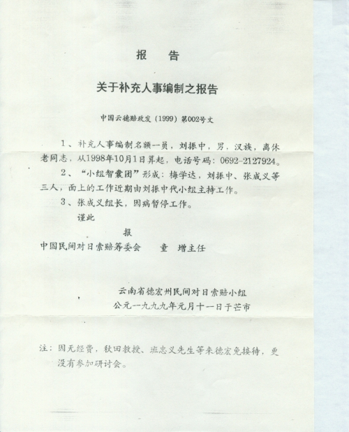 细节:告知云南省德宏州对日索赔小组人员变动情况。