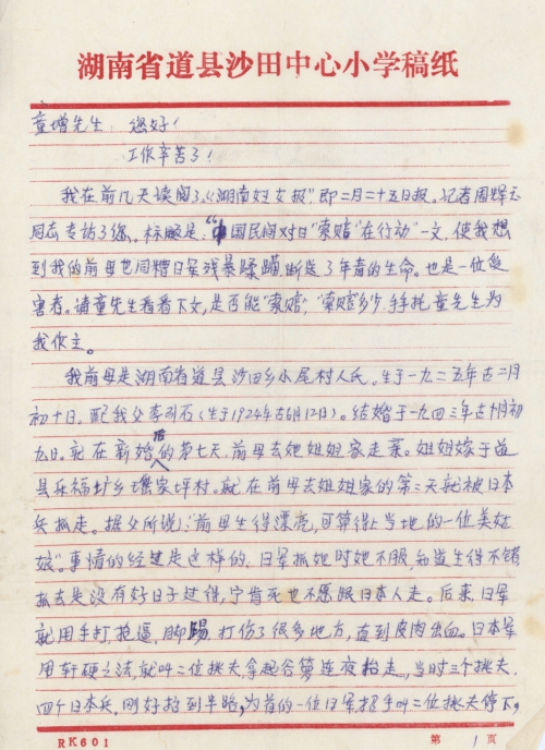 The other day, I read an article entitled Civil Claim for Compensation from Japan Is Underway in China from Hunan Women’s News of February 25, in which reporter Zhou Huiyu interviewed you. The article brought back my memory of how my father’s former wife died at a young age after being raped by the Japanese army. She was also a victim. Mr. Tong, please read the following article and tell me if I can claim for compensation and how much I can claim? Please help me.