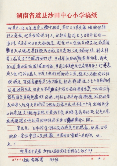 My father’s former wife was born on lunar February 10, 1925 in XX Village, Shatian Town, Dao County, Hunan Province and married my father Li Yinshi (born on lunar June 12, 1924) on lunar October 9, 1943. On the 7th day after their marriage, my father’s former wife paid a visit to her older sister, who was married in XX Village, Lefukuang Town, Dao County. On the second day after she arrived at her older sister’s home, she was taken away by Japanese soldiers. My father told me, “My former wife had a reputation for beauty among the local people.” The thing happened like this. When the Japanese soldiers tried to take her away, she resisted, knowing that it was not a good thing for a beautiful girl like her. She would rather die than be taken away by the Japanese. Afterwards, the Japanese soldiers forced her by beating and kicking her until she bled. Then, they asked two porters to carry her away in a large basket in the night. When the 3 porters and 4 Japanese soldiers reached halfway, the Japanese soldier in the front waved to signal the porters to stop and asked a Japanese soldier to watch them. Then, the other 3 Japanese soldiers threw themselves at my father’s former wife like hungry wolves and raped her in turns. After that, she was carried to Daozhou where the Japanese army was stationed. After she arrived, the head of the Japanese army immediately ordered the porters to carry her to his room and raped her. Afterwards, he raped her every night for 10 days.