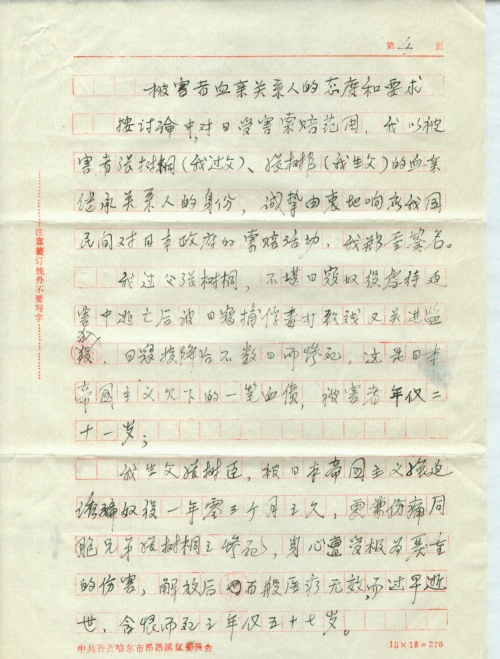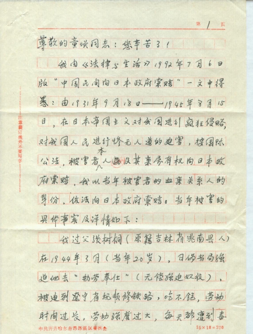From the article “Chinese Civilian Compensation Claim against the Japanese Government” published by “Law and Life” on July 6, 1992, I learned that: From September 18, 1931 to August 15, 1945, while the Japanese Imperialism frantically invaded China, and implemented utterly inhuman persecution against Chinese people, according to international public law, the victim himself and relatives are entitled to demand claim against the Japanese government; as the blood relative of victims in those years, I demand compensation from the Japanese government in accordance with law. The detailed facts and processes of persecution are below: