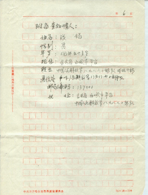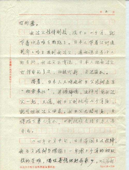Other details:My foster father Zhang Shutong was originally from Jilin Province. In March 1944, he was caught by the Japanese soldiers to repair railways in Liaoning Province. He was beaten cruelly and did not have enough to eat every day. During the period, my foster father took 18 fellow sufferers to escape, but were caught again. He was beaten with his leg broken and was put into prison. My natural father Zhang Shuchen was also deceived by the Japanese soldiers to do hard labor. He was released after the victory of Anti-Japanese War in 1945.