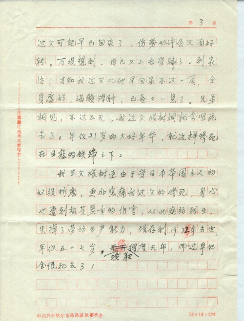 Owing to the slavery torment by the Japanese imperialism, and the heavy blow of my foster father’s violent death, My natural father Zhang Shuchen also suffered severe damage both physically and mentally, since then he became weak in the rest of his life, and lost the ability to work, he passed away in 1972, aged only 57, too early to be able to enjoy natural span of life, he passed away in deep hatred!