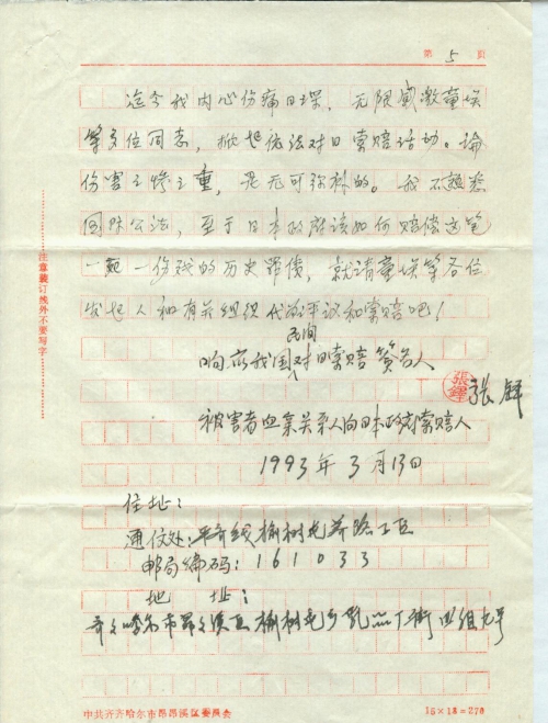 In accordance with the scope of damage compensation toward Japan in the discussion, in the capacity of blood relative of the victim Zhang Shutong (my foster father), and Zhang Shuchen (my natural father), I sincerely and whole-heartedly respond to Chinese civilian claim activity against the Japanese government, I hereby sign my name solemnly.