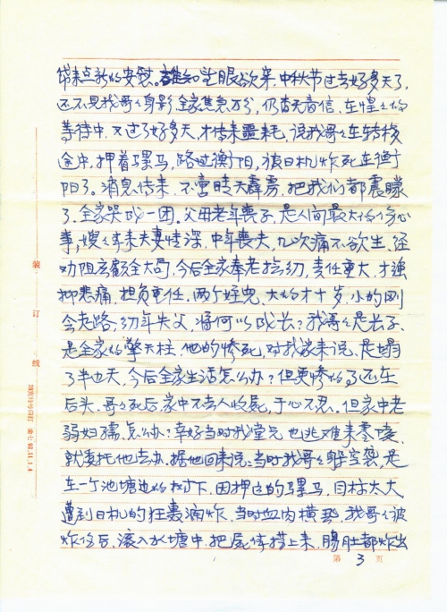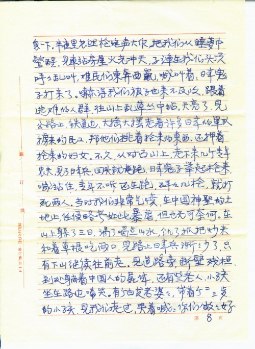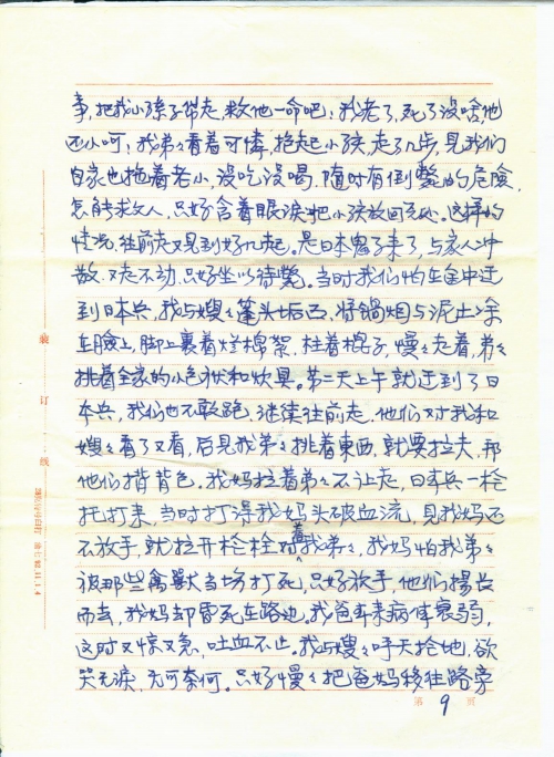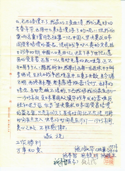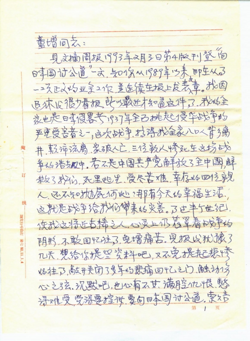 见文摘周报1993年2月3日第4版刊登“向日本国讨公道”一文,知你从1989年以来,即在从事一项正义的业余工作,并连续在报上发表文章。我因退休后很少看报,所以最近才知道这件事。我的全家也是日本侵略者1937年全面挑起侵华战争的严重受害者之一;这次战争,搞得我全家八口人背乡离井、颠沛流离、家破人亡,三位亲人惨死在这场战争的浩劫中。若不是中国共产党解放了全中国,解救了我们,死里逃生、受尽苦难,幸存的四位亲人,还不知抛尸何处?[哪]有今天的幸福生活,这就是战争给我们带来的灾害。事过半个世纪,使我这将近古稀之人,心灵上仍笼罩着战争的阴影,不敢回忆往事,免增痛苦。见报后犹豫了几天,想给你提些资料吧,又不免提起悲惨的往事,敲开关闭了多年的悲痛回忆之门,触动伤心之弦,沉默吧,也心有不甘,满腔仇恨,憋得难受,觉得要控诉,要向日本国讨公道,索赔么,它也赔偿不了,我家的三条血债,我们美好的青春年华,这用什么来赔偿得了的呢?!但我们要响应童增同志征集一亿中国人坚决要求日本国受害赔偿的签名。说明战争对人类的灾害。抗日战争时期,中国人口是四亿,过去了半个世纪,遗留的受害者还有一亿。当时无辜的死难者,还不知有多少人?据我所知,我单位还有一位退休干部,叫李瑞清,在抗日战争逃难途中,与妻子失散,至今下落不明,而终身未娶,老来落得孤苦伶仃,这样的情况,当时是数不清的。下面我将我们家在1931-1945年间,受日本军国主义侵华战争后的苦难历程叙述于后,作为“坚决要求日本国受害赔偿”的签名者。只是年代久了,具体时间记不太清,可能时间有点出入,但总体时间是在1937-1945年间。费心之处,不胜感谢!