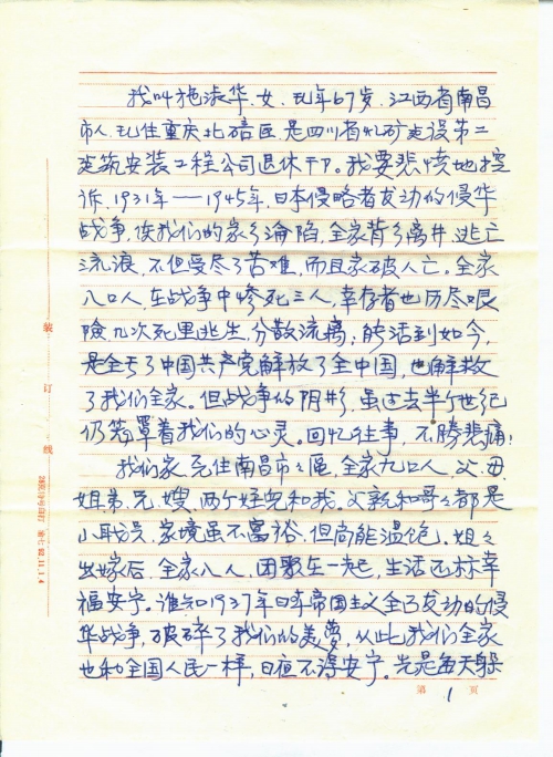 我叫施淑华,女,现年67岁,江西省南昌市人,现住重庆北碚区,是四川省煤矿建设第二建筑安装工程公司退休干部。我要悲愤地控诉1931年-1945年,日本侵略者发动的侵华战争,使我们的家乡沦陷,全家背乡离井,逃亡流浪,不但受尽了苦难,而且家破人亡。全家八口人,在战争中惨死三人,幸存者也历尽艰险,几次死里逃生,分散流离;能活到如今,是全亏了中国共产党解放了全中国,也解救了我们全家。但战争的阴影,虽过去半个世纪仍笼罩着我们的心灵。回忆往事,不胜悲痛!