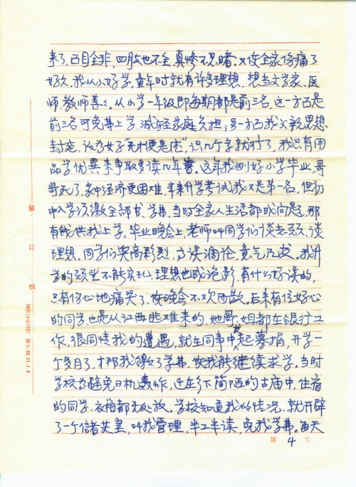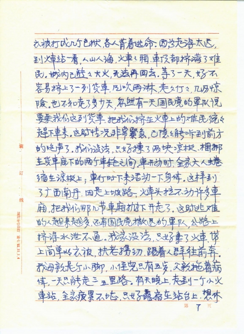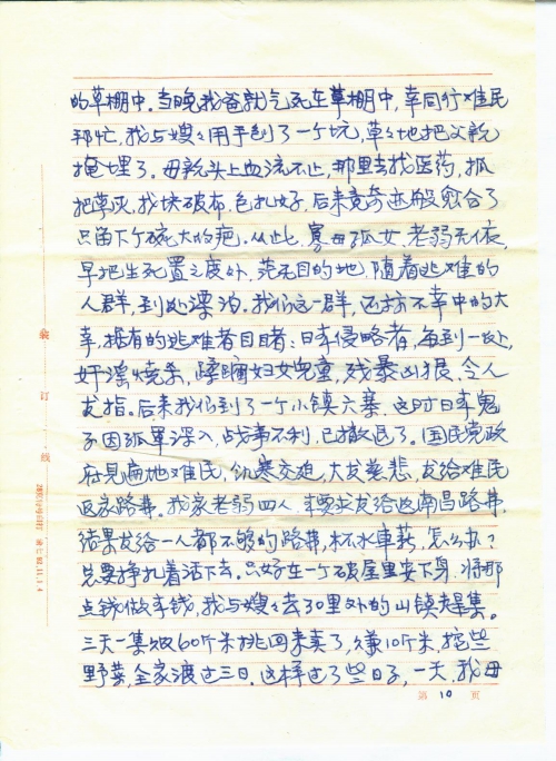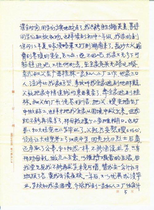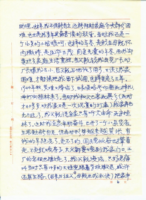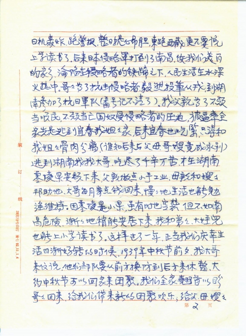 我们家原住南昌市市区,全家九口人,父、母、姐、弟、兄、嫂、两个侄儿和我。父亲和哥哥都是小职员,家境虽不富裕,但尚能温饱。姐姐出嫁后,全家八人,团聚在一起,生活还算幸福安宁。谁知1937年日本帝国主义全面发动的侵华战争,破碎了我们的美梦,从此我们全家也和全国人民一样,日夜不得安宁。光是每天躲日机轰炸,跑警报,整日提心吊胆,东跑西藏,更不要说上学读书了。后来日本侵略军打到了南昌,使我们美丽的家乡沦陷在侵略者的铁蹄之下,人民生活在水深火热中。哥哥为了抗击侵略者毅然投笔从戎,到湖南参加了抗日军队(番号记不清了)。我父亲为了不愿当顺民,不愿当亡国奴受侵略者的压迫,被逼率全家先是逃到宜春我姐姐家,后来宜春也吃紧,只得和我姐姐骨肉分离(谁知后来与父、母、哥、嫂竟成永别)逃到湖南找我大哥,吃尽了千辛万苦,才在湖南零陵景安顿下来,父亲做点小手工业,母亲和嫂嫂帮助他,大哥每月寄点钱回来,慢慢地生活也能勉强维持。因零陵是小县,虽有时也空袭,但不如南昌危险,渐渐地稍能安居下来,我和弟弟、大侄儿也能上小学读书了。这样过了一年,正当我们庆幸生活日渐好转的时候,1939年中秋节前夕,我大哥来信说,他们部队要从前方换防到后方来休整,大约中秋节可以回家来团聚。我们全家翘首以盼哥哥回来,给我们带来新的团聚欢乐,给父、母、嫂嫂带来点新的安慰。谁知望眼欲穿,中秋节过去好多天了,还不见我哥哥身影,全家焦急万分,仍杳无音信。在惶惶的等待中,又过了好多天,才传来噩耗,说我哥哥在转移途中,押着骡马,路过衡阳,被日机炸死在衡阳了。消息传来,不禁晴天霹雳,把我们都震懵了,全家哭成一团。父母老年丧子,是人间最大的伤心事,嫂嫂素来夫妻情深,中年丧夫,几次痛不欲生,经劝阻应顾全大局,今后全家奉老拎幼,责任重大,才强抑悲痛,担负重任,两个侄儿,大的才十岁,小的刚会走路,幼年失父,将何以成长?我哥哥是长子,是全家的擎天柱,他的惨死,对我家来说,是塌了半边天,今后全家生活怎么办?但更惨的事还在后头,哥哥死后,家中不去人收尸,于心不忍。但家中老弱妇孺,怎么办?幸好当时我堂兄也逃难来零陵,就委托他去办。据他回来说:当时我哥哥躲空袭,是在一个池塘边的树下,因押运的骡马,目标太大,遭到日机的狂轰滥炸,当时血肉横飞,我哥哥被炸伤后,滚入水塘中,把尸体捞上来,肠肚都炸出来了,面目全非,四肢也不全,真惨不忍睹,又使全家伤痛了好久。我从小好学,童年时就有许多理想,想当文学家、医师、教师等等。从小学一年级即每期都是前三名,这一方面是前三名可免费上学,减轻家庭负担;另一方面我父亲思想封建,认为女子“无才便是德”,识几个字就行了,我只有用品学优异来争取多读几年书。这年我刚好小学毕业,哥哥死了,家中经济更困难,本来升学考试我又是第一名,但初中入学须缴全部书、学费,当时全家人生活都成问题,[哪]有钱供我上学。毕业晚会上,老师叫同学们谈志愿、谈理想。同学们兴高[采]烈,高谈阔论,意气风发。我升学的愿望不能实现,理想也成泡影,有什么好谈的,只有伤心地痛哭了,使晚会不欢而散。后来有位好心的同学,也是从江西逃难来的,她哥、姐都在银行工作,很同情我的遭遇,就在同事中发起募捐,开学一个多月了,才帮我缴了学费,使我能继续求学。当时学校为避免日机轰炸,迁在乡下简陋的古庙中,住宿的同学,衣箱都无处放,学校知道我的情况,就开辟了一个储藏室,叫我管理,半工半读,免我学费。每天课余时间,同学们高兴地玩去了,我只能守在储藏室,等待同学们取放衣物。这样读到初中二年级,我家的创伤刚刚平复,日本侵略军又打到湖南来了。长沙大火,威胁到零陵的安全,怎么办?不逃吧,我家又无乡下可躲避,逃吧,又往何处去?在全家走投无路之际,幸我叔父在广西桂林一家私人小厂工作,他家三口人,经济比我家好些,来信叫我全家逃到他那里去。父亲把家中稍值钱的东西变卖了,率全家逃到桂林。叔父向厂子说尽好话,把父、嫂安插在厂中做临工,这样才把我全家从困境中救出来。但我就不能再读书了,帮母亲摆个小茶摊糊口。这时弟弟和大侄儿也小学毕业了。父亲为安慰嫂嫂的心,设法让大侄儿考上了汉民中学,因是抗日烈士后裔,还争取了公费。弟弟和我一样,不能继续求学,只有帮助母亲,做点小生意,以维持艰苦的生活,后我堂兄见我不能再求学,未免可惜,替我在一会计补习班报了名,要我去读夜校。一年后,又以优异成绩毕业。学校知我家困境,介绍我到一家私人工厂任会计助理。这样,我不但能自立,还能帮助家庭解决部分困难。这也是我多年发奋苦读的愿望。当时我还是一个16岁的小姑娘呵!这样的年龄,是赖在母亲怀内撒娇,是风华正茂、前途无量的年龄,而我却要担负家庭生活重担。当父亲领我去见厂长时,厂长嫌我太小,后父亲与他谈了同乡,又谈了我家困难,才勉强把我留下试用。这样安定了三年。1944年秋,灾难又降临了,日本侵略者作垂死挣扎,冲打向桂林来了。当时我叔父已客死异乡(死时才40多岁,对我家又是一次沉重的打击)我家再也无力逃了。我父亲说全家只有听天由命,死守桂林了。这时我全家辛勤奋斗,已开了一个小杂货店,生活勉能自足,但当时形势越来越紧张,有钱的早跑光了,走不了的,国民党政府也撵着走,不走就烧房子,大火都要烧到我家门口,