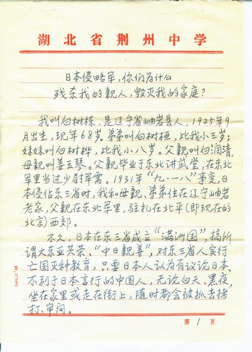 I am Bai Shudong, a native of Xiuyan County, Liaoning Province, born in September 1925, now 68. My younger brother is Bai Shuheng, who is three years younger than me; my younger sister is Bai Shuhua, who is eight years younger than me. My father is Bai Runqing, my mother is Jiang Yuqin. My father graduated from the Northeast Military Academy, and worked as Lieutenant Quartermaster in the Northeast Army. At the time of the “September 18” Incident in 1931, when Japan invaded the three provinces in Northeast China, my mother, my younger brother and I lived at Xiuyan hometown in Liaoning, my father served in the Northeast Army, and stationed at western suburb of Peking (now Beijing).