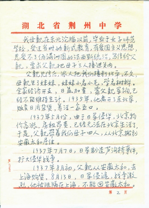 In May 1937, because of invasion of the Japanese Army, prices in Peking soared, rent was expensive, we could no longer live in Peking any more, so my father took us four and left Peking to move to Taihe in Anhui.