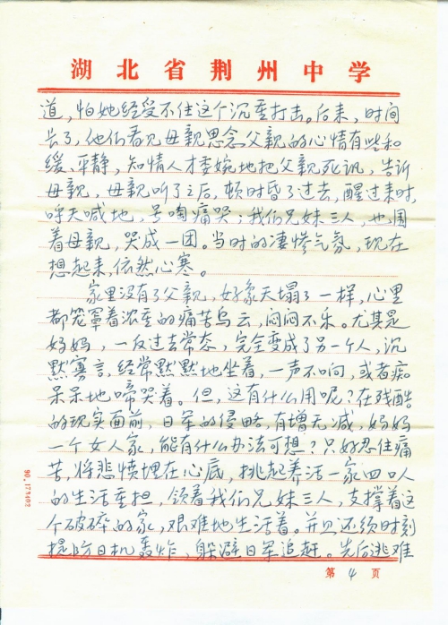The news that my father was killed by the Japanese was kept unknown from my mother, at first mother knew nothing, others who had learned the news also avoided telling her, afraid that she would be unable to withstand this heavy blow. Later, as time passed, they saw my mother had become mollified in her missing of my father, someone gently broke the news of my father’s death to her, my mother instantly fainted after hearing the news, when she came to, she yelled in desperation, and cried bitterly; we three siblings also burst into tears around my mother. The tragic atmosphere at that time was still chilling in recollection even today.