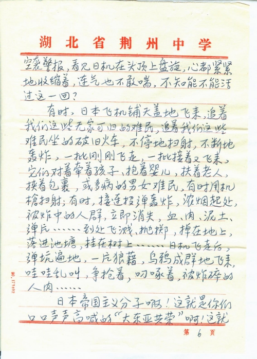 In the late stage of the war, the Japanese Army became more ferocious and frenetic, almost inhuman. The battle line became longer, the fight intensified; the death toll of the war soared; the means of persecution escalated; bombing by Japanese aircrafts never interrupted day and night, there was not a moment of peace at any given time, people spent the whole day in great anxiety, for at any time one may perish either due to bombing o shooting. Especially when hearing emergency air raid alarm, and seeing Japanese aircrafts hovering above overhead, one would develop a sinking feeling, and wait with abated breath, wondering if one could survive this time?