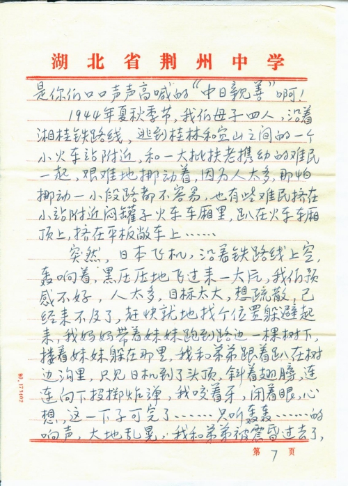 All of a sudden, Japanese aircrafts appeared over the railway line, a large flock of rumbling mass that darkened the sky, we felt it’s ominous, because there were too many people, the target was too big, we wanted to disperse, but it’s already too late, we hurried to find places nearby to hid ourselves, my mother carried my younger sister and ran to a tree on the road side, and hugged my younger sister and hid there, my younger brother and I followed them and crouched in the ditch beside the tree, we saw the Japanese aircrafts moved overhead, tilted its wings and dropped bombs successively, I gnashed my teach, and closed my eyes, thinking, this would be it……As we heard rumbling of the explosion, the earth trembled, my younger brother and I were momentarily shocked into coma by the explosion, after the enemy aircrafts left, we shook off dirt on our body splashed by the bombing, got up, it was then that we saw mother had been killed under the tree, the tree was also torn apart in a mess, my younger sister collapsed beside my mother, her head had cracked; my younger brother and I shouted, and rushed out, hugged the bodies of my mother and my younger sister, cried aloud. Alas! Who could have imagined, we were forced by the Japanese invaders to flee to the southern side of the Shanhaiguan Pass, and then from North China to South China, only to find my mother and my younger sister dead in the wilderness in the end, they died in the hands of the vicious Japanese. Where is justice? Where is fairness?