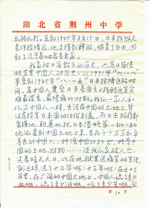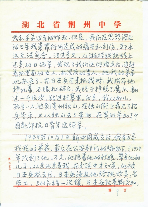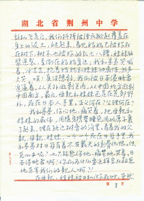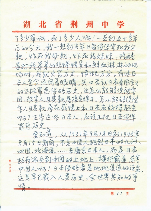 The history of my family’s destruction by the Japanese invaders also bears witness to the history of slaughter of Chinese by the Japanese invaders. From the “September 18” incident in 1931 till “August 15” in 1945 when Japan surrendered, this period recorded the profoundest and most painful period of relentless persecution of the Chinese people by Japanese Imperialism. Like hundreds of millions of other Chinese people, my whole family lived on Chinese territory, and did not damage any interest of Japan, instead the Japanese government barbarically and savagely sent batch after batch of Japanese Invasion Army onto Chinese territory, killed tens of millions of peaceful and kind Chinese people, raped Chinese women, plundered Chinese land, possessions…… meanwhile broke up our families, and we lived a life devoid of happiness which was inferior to life in prison, in this way thirteen years passed! Within these thirteen years, on the vast Chinese territory, how much blood had been shed, how much tears had been wasted, ho much hardships had been experienced, how much pain had been tolerated, how many people have been killed! Even today, more than 50 years after the War, whenever I remembered the horrible scenes and bloody sites when the Japanese invaders killed my father, my mother, and my younger sister, and cruelly tortured my younger brother, I would fly into a rage, and seethe with fierce hatred. Some Japanese even today completely deny the crime-infested invasion history of the Japanese Imperialism with closed eyes, how could the victim country, victims and victims’ family members tolerate such nonsense, how could the victims and victims’ family members develop friendship with Japan emotionally? I would like to sternly warn such Japanese to squarely confront the criminal history of Japanese invasion.