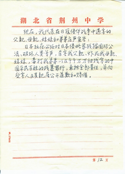 The Japanese government must assume full responsibility for trampling international public law, damaging human dignity by Japanese Invasion Army, including drowning my father, killing my mother, my younger sister, and beating my younger brother as well as atrocities committed against thousands of millions of persecuted Chinese civilians, and openly apologize and offer compensation to victims and their family members.