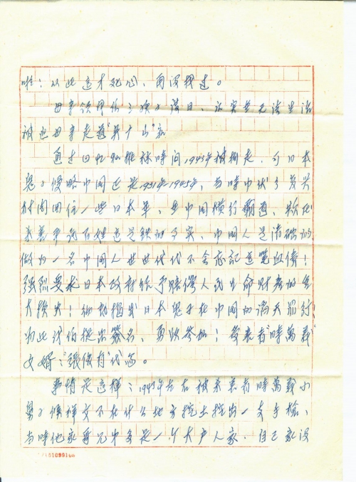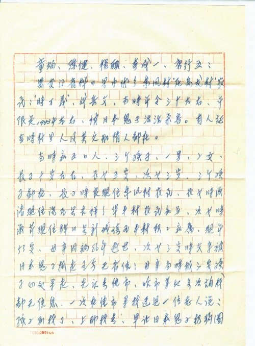 通过回忆和推算时间1943年被抓走,可日本鬼子侵略中国正是1931年—1945年,当时中伏乡复兴村周围住一些日本军,在中国横行霸道,欺压杀害平民百姓,这是铁的事实,中国人是清[楚]的,[作]为一名中国人世世代代不会忘记这笔血债!强烈要求日本政府给予赔偿人民生命财产的重大损失!彻底揭发日本鬼子在中国的滔天罪行!为此我们提出签名,[踊]跃参加!受害者“时万義”女婿:“张俊有”代写。