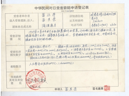 中华民间对日受害索赔申请登记表