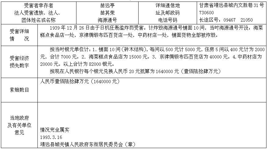 细节:1939年12月26日由于日机的狂轰乱炸而受伤,日寇还炸毁了铺面10间、糕点食品店一处、百货店一处、中药材一处。要求日本赔偿所有损失。