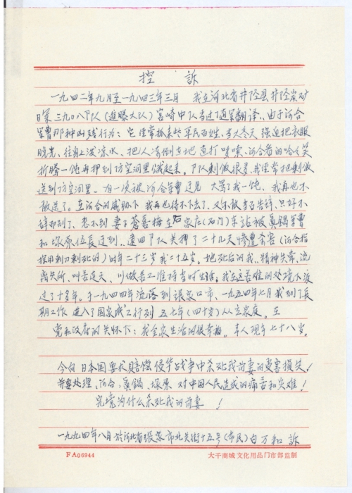 一九四二年九月至一九四三年三月,我在河北省井陉县井陉炭矿,日军三九〇八卫队(进曝大队)宫崎中队当过随军翻译,由于河合军曹那种凶残行为:它经常抓来些平民百姓,当大冬天强迫把衣服脱光,往身上泼凉水,把人冻倒在地直打哆嗦,河合看的哈哈大笑折腾一[顿]再押到防空洞里饿起来。部队剩饭很多,我经常把剩饭送到防空洞里,有一次被河合军曹遇见,大骂了我一[顿],我再也不敢送了,在河合的威胁下,我再也待不下去了,又不敢当面告辞,只好不辞而别了,想不到妻子苍喜梅在石家庄(石门)车站被真锅军曹和塚原伍长遇到,逮回部队关押了二十几天惨遭杀害(河合指挥用刺刀刺死的)时年二十三岁我二十五岁。她死后的我精神失常,流离失所,叫苦连天,以做苦工维持当时的生活,我在这苦难的处境下渡过了十多年。于一九四四年流落到张家口市,一九五四年七月找到了长期工作,进入了国家职工行列,五七年(四十岁)从立家庭。在党和政府的关怀下:我全家生活的很幸福。本人现年七十八岁。