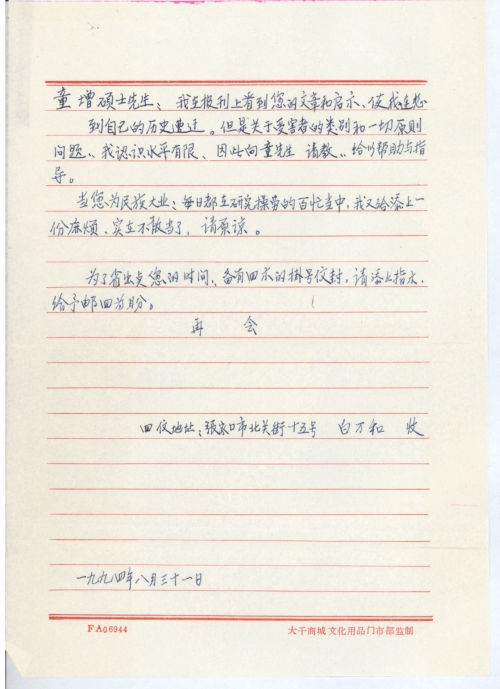 我在报刊上看到您的文章和启示,使我联想到自己的历史遭遇。但是关于受害者的类别和一切原则问题,我认识水平有限,因此向童先生请教,给以帮助与指导。