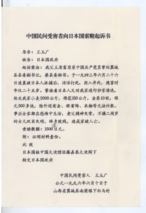 起诉案由:我父王原富原系中国共产党员曾任翼城县县委副书记,兼县委秘书。于一九四三年六月二十六日凌晨被日本人抓捕后,活活打死,投入井内,遇害时年仅二十五岁。紧接着日本人又对我家进行抄家清洗,抢走我家小麦2000公斤,棉花150公斤,金条10锭,银元300多块,除外还有金、银首饰、衣物等无法计数。事后全家都在恐怖中生活,老父精神失常,不满二周岁的女儿双目失明,终身致残,造成家破人亡。