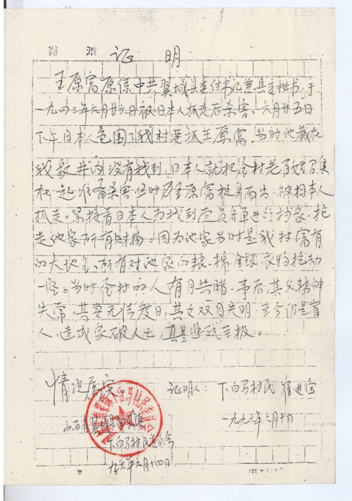 王原富原系中共翼城县委[副]书记兼县委秘书,于一九四三年六月二十六日被日本人抓走后杀害,六月二十五日下午日本人包围了我村要抓王原富,当时他藏在我家井内没有找到,日本人就把全村老百姓召集在一起准备杀害,这时王原富挺身而出,被日本人抓走。紧接着日本人为找到党员名单进行抄家,拖走他家所有财物。因为他家当时是我村富有的大地主,所有对他家的粮、棉、金银、衣物抢劫一空。当时全村的人有目共睹。事后,其父精神失常,其妻无法度日,其女双目失明,至今仍是盲人,造成家破人亡,真是悲残至极。