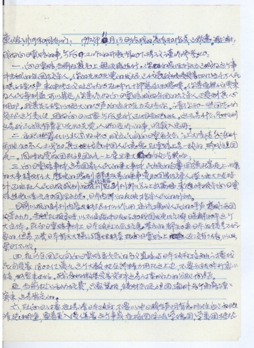 三、向日索赔事件,这是国家人民的重大事件,民族的自尊,国强民富走上小康的大事。钱财之大,历史的悲剧都是头等的重事。党和国家领导人除了应大力支持外,还应在人民日报或别的报刊放消息,在副刊都能让出篇幅,来随时报道向日索赔进展情况和国际动态,日本内部的反[应]指导人民的行动。