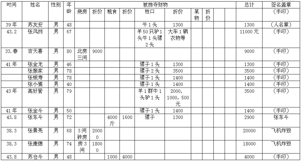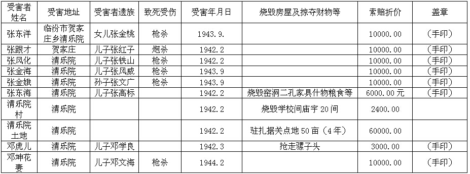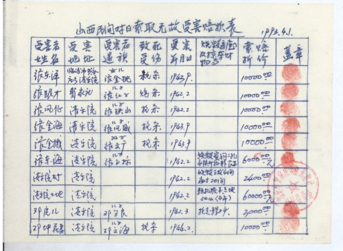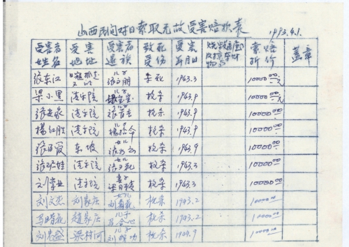 细节:寄来几份“山西民间对日索取无故受害赔偿表”详细记录了受害者损失情况和信息。