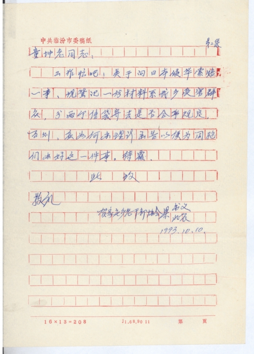 工作忙吧!关于向日本侵华索赔一事,现登记一份材料系我乡受害群众,分两个信袋寄去是否合乎规定,否则,应如何办理望函告以便为同胞们办好这一件事。待复。