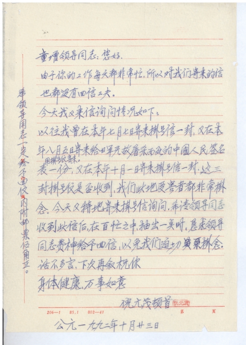 以往我曾在本年七月七日寄来挂号信一封,又在本年八月五日寄来给日军无故屠杀而死的中国人民签名表一份,用挂号信寄来。又在本年十月一日寄来挂号信一封,这三封挂号信是否收到,我们此地受害者都非常挂念,今天又特地寄来挂号信询问,希请领导同志收到此信后,在百忙之中,抽出一点时,恳求领导同志费神给予回信,以免我们迫切挂念。话不多言,下次再叙。