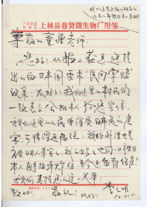 从报上获悉您提出的向日本国要求“民间索赔”议案,太好了!我们这里的村民们一致表示,公推本人给您写信,我们这里的人民曾深受日本鬼的危害,可谓深恶痛绝!我的外婆也是被日本人杀害的,我的妈妈也同一日被日本人用手榴弹炸伤,至今还留有伤痕!我们支持您的这一义举!
