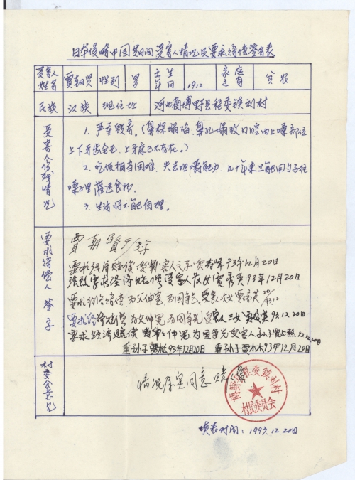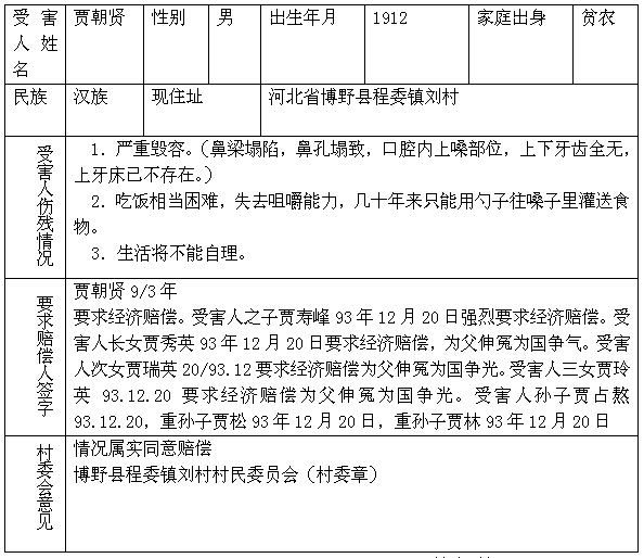 21 10 月, 2018 s2885 Share EmailTwitterFacebookGoogle +PinterestTumblrLinkedinVkontakte 信扫描序列号:s2885 写信日期:1993-12-20 写信地址:河北省保定市博野县 受害日期:信中未提 受害地址:信中未提 写信人:贾朝贤的家人 受害人:贾朝贤 类别:其它(OT) 细节:贾朝贤的家人寄来一份“日本秦洛中国期间受害人情况及要求赔偿签名表”一份,详细说明了受害者的损失以及家里人支持赔偿的签名。 日本侵略中国期间受害人情况及要求赔偿签名表 填表时间:1993.12.20日 21 10 月, 2018 10000cfj_3o5som 其它(OT)