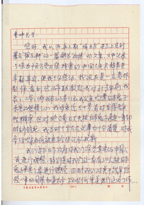 我们要求日本政府对我们深受其害的中国人民进行赔偿,特别是对我们这一家有三口人被日本鬼子杀害之家进行赔偿,但由于我们对关于战争赔偿一事的国策知道太少,不知从何渠道进行这项工作,因此感到很渺茫,今特提笔给您去信,望您能在百忙之中,给于我们指导,了却我们思父之心,了却九十高龄母亲思夫之情。