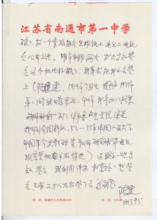 您呕心沥血的搞,已取得喜人的成绩,由您带头,坚持搞下去,这是全国性爱国主义教育,近代史、现代史、国际教育,打开突破口,搞一个索赔协会,在报纸上、电台上、电视台公布宣传。明年利用两会扩大高知签名这个做法好极了。我要求把我的名签上(陆建,1919年3月生,1939年弟弟16岁被日寇杀死,40年,我参加八路军到了华中鲁艺学院深造,战斗到全国解放,52-55年中国人民大学中国革命史教研室教师研究班毕业,现享受地市级待遇)还联系一些高知签名,我利用申办和索赔一起签名,已有2万人左右签了名。