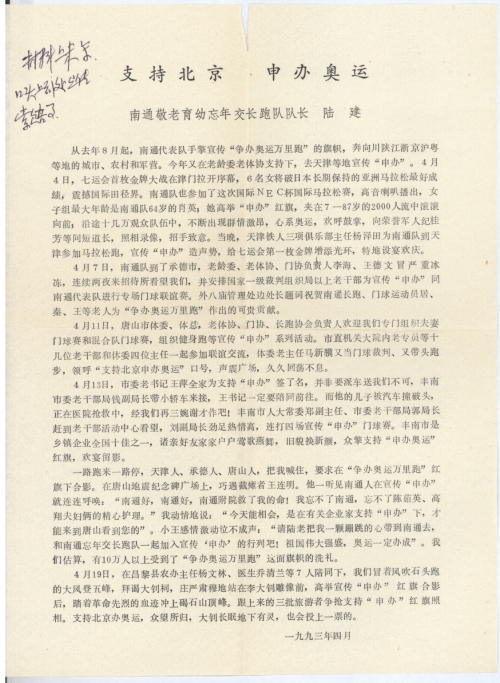 4月7日,南通队到了承德市,老龄委、老体协、门协负责人李海、王德文冒严重冰冻,连续两夜来招待所看望我们,并安排国家一级裁判组织局以上老干部为宣传“申办”同南通代表队进行专场门球联谊赛。外八庙管理处边处长题词祝贺南通长跑、门球运动员居、秦、王等老人为“争办奥运万里跑”作出的可贵贡献。