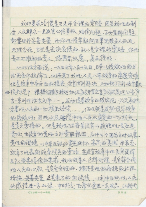 我的要求赔偿是正义而合理的索赔,因为我国的制度,人民群众一旦发生[工]伤事故,赔偿问题,子女安排问题都要进行妥善安置,而你国侵华期间日军无故杀人致死,天理[何]在,当然是应该负[责]的。所以是合理的索赔,你国是不可推卸的责[任],请严肃考虑,复函说明。