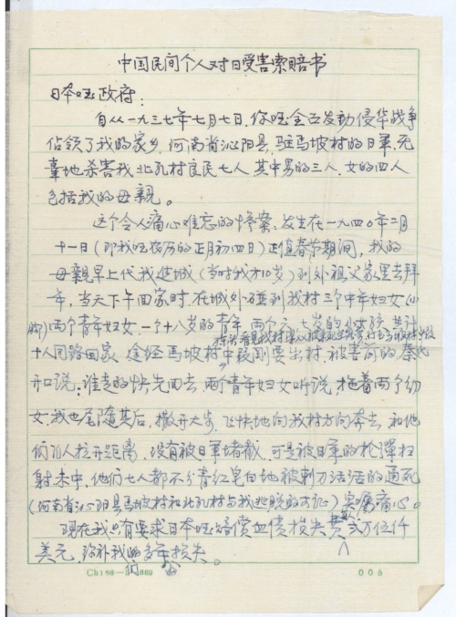 My claim for compensation is just and reasonable because according to the system in my country, if the people suffer from a work-related injury or an accident, their children shall be properly compensated. As the Japanese army killed people for no reason during Japan’s invasion of China, the Japanese government is inescapably responsible for compensating the victims. Please think about this seriously and reply us.