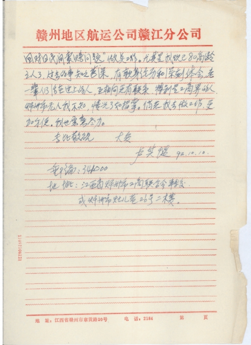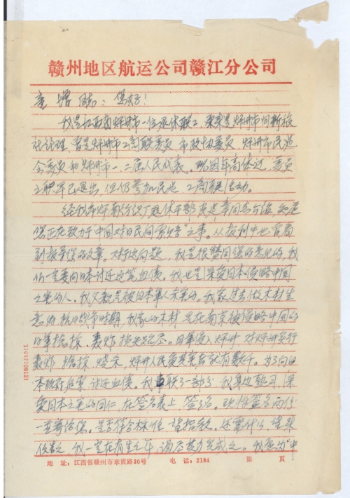 经我市赣南纺织厂退休干部皮建章同志介绍,知道您正在致力于“中国对日民间索赔”之事。从报刊中也曾看到报导您的文章。对于这问题,我是很赞同您的意见的,我们一定要向日本讨还这笔血债。我也是深受日本侵略中国之害的人。我父亲是被日本军人杀害的。我家过去做木材生意的,抗日战争时期,我家的木材,是在南京被侵略中国的日军抢掠、轰炸损失殆尽。日军侵入赣州,对赣州实行轰炸、抢掠、烧杀,赣州人民受其害者就有数千。为了向日本政府追索,讨还血债。我串联了一部分,我身边熟习、深受日本之害的同仁,在签名表上签了名。现将签名两份一并寄给您。是否符合标准,望指教。还需什么,望来信告之。我一定在有生之年,歇尽其力完成之。我愿为“中国对日民间索赔问题”做点工作。尤其是我现已80高龄之人了,过去的事知之甚深,有亲身经历和深刻体会,老一辈仍活在世上的人,互相间更有联系,特别是工商界的人,赣州市无人我不知,情况了如指掌。倘若我去做工作,更加方便。我也愿意尽力。