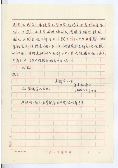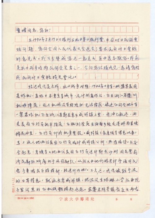 According to an article published in the 4th edition in Newspaper Digest of May 19, 1992, you’ve submitted a proposal about demanding civil compensation from Japan to the National People’s Congress. I fully support the proposal and I am sincerely grateful to you. My family are victims of the anti-Japanese war. I am writing to report to you and sincerely ask you to register us in the list of victims demanding compensation from Japan.