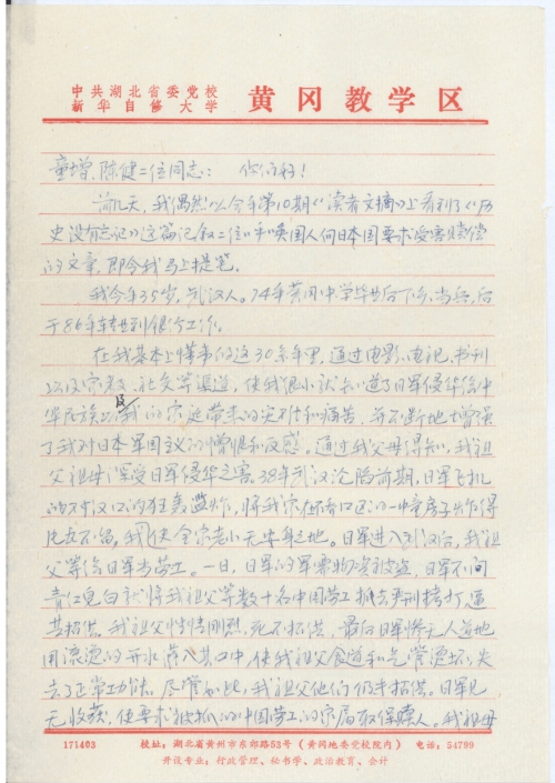 Several days ago, I accidentally read the article “History Has Not Forgotten” on the 10th issue of the “Readers’ Digest”, an article describing you two calling for Chinese nationals to demand damage compensation from Japan, which prompted me to immediately pick up a pen to write this letter.