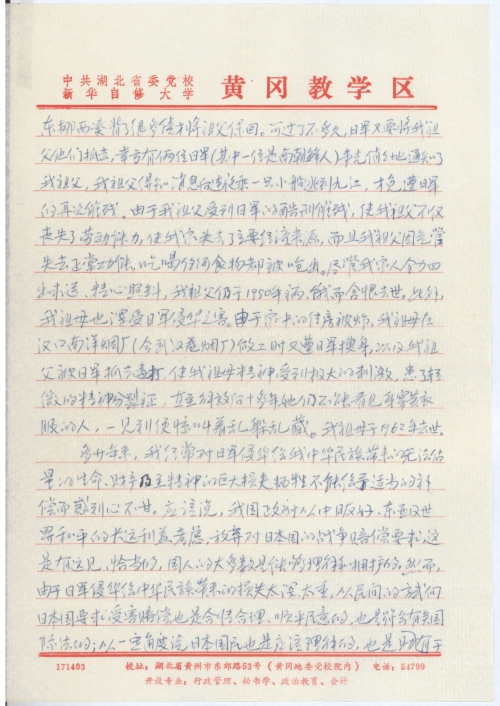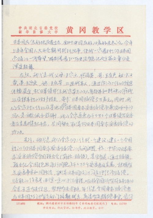Meanwhile, on behalf of my whole family, I want to propose a suggestion: Establish a nationwide non-governmental organization for seeking damage compensation from Japan, whose name can be: China Federation for Seeking Damage Compensation from Japan (Compensation Federation). Its aim: Through the Compensation Federation, unite tens of thousands of victims and their family members across the country (including overseas compatriots), based on relevant damage facts and international laws, obtain reasonable compensation from the Japanese government. The Compensation Federation’s mission: Compile certain articles of association, absorb all qualified members across the nation, communication related info, sort out related documents, and contact relevant departments of the Japanese government on behalf of all claimers across China to put forward and negotiate relevant compensation matters, and finally finish the claim task entrusted by all claimers from across China.